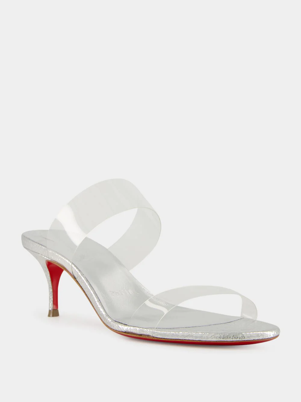 The Just Nothing mule by Christian Louboutin is a study in minimal elegance. Crafted with a sleek 55 mm heel in silver laminated calf leather, this refined design features transparent TPU straps that create a barely-there effect. Lightweight and daring, it offers a modern silhouette perfect for day-to-night sophistication. The iconic red sole adds a signature touch of allure to every step.