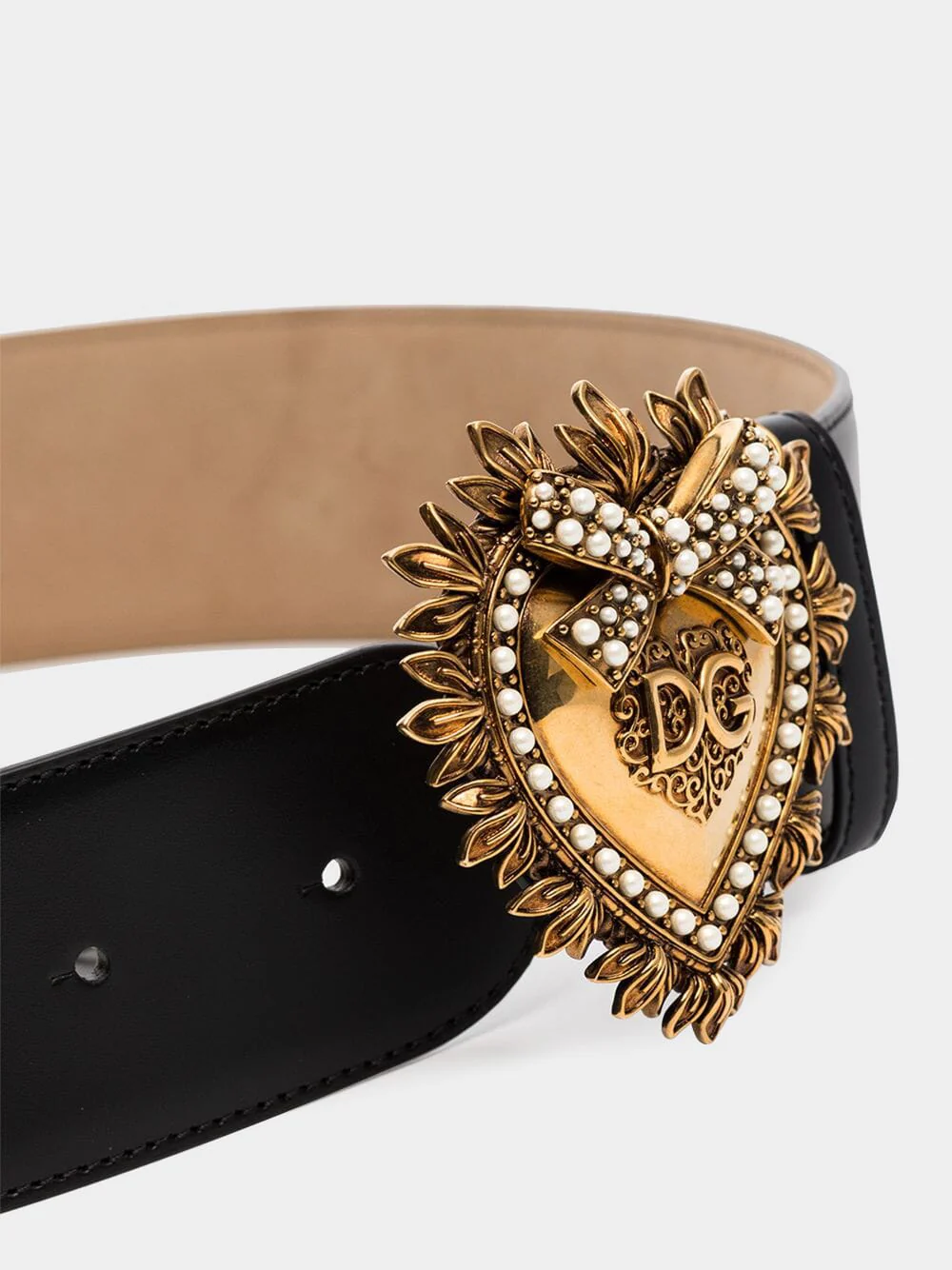 Dolce & Gabbana Devotion black lux leather belt with branded bejeweled heart buckle hand-tooled.