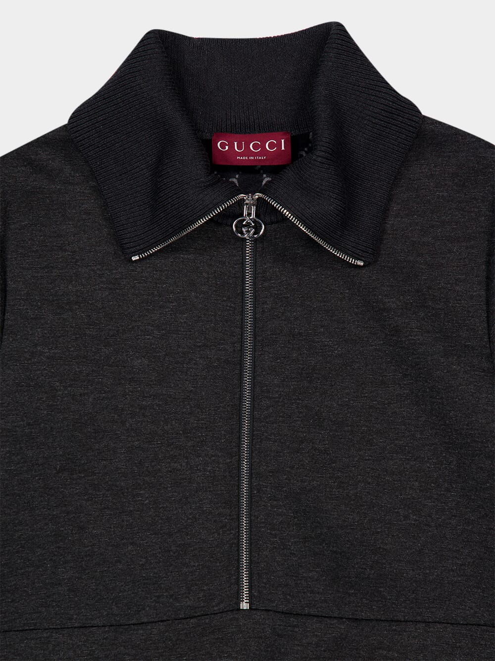 Minimalist in silhouette, this dark grey mini dress from Gucci merges casual ease with refined craftsmanship. Made from a structured knit, it features a standout half-zip front and exaggerated collar for a touch of retro athletic flair. Perfect for styling solo or layering under outerwear.