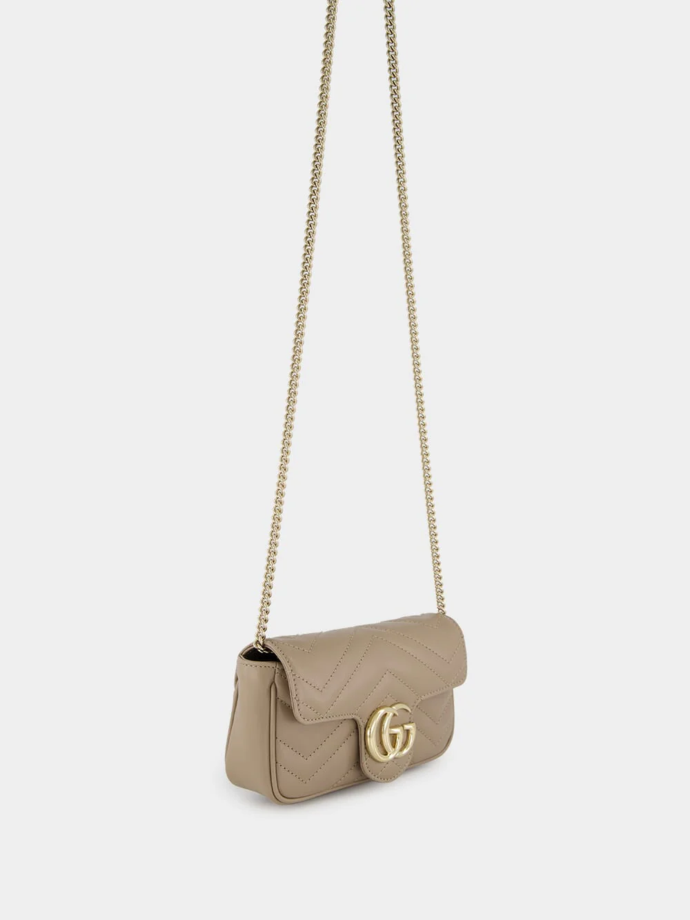 The taupe leather GG Marmont super mini bag by Gucci is a refined accessory that showcases the house's iconic Double G logo, first introduced in the 1970s. Crafted from matelassé chevron leather, it features light gold-toned hardware, a microfiber lining with a suede-like finish, and a detachable key ring for added versatility. The chain shoulder strap offers a 60cm drop, making it ideal for crossbody or shoulder wear. With a super mini size, this bag embodies Florentine craftsmanship and elegance, accommodating essentials like an iPhone Pro Max, AirPods, card case, and lipstick.