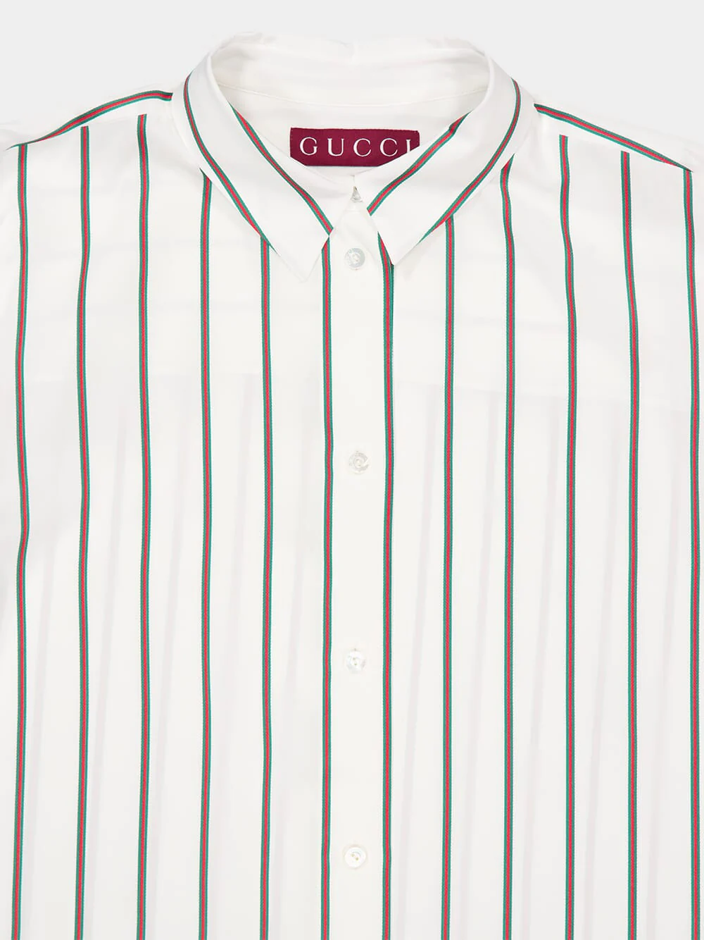 This long-sleeved silk shirt from Gucci reinterprets classic tailoring with a refined, modern touch. Crafted from luxurious silk, the crisp white base is elevated with vertical stripes in the signature Gucci Web-inspired tones. The relaxed silhouette and clean lines make it an effortlessly elegant wardrobe staple, perfect for both smart and casual styling.
