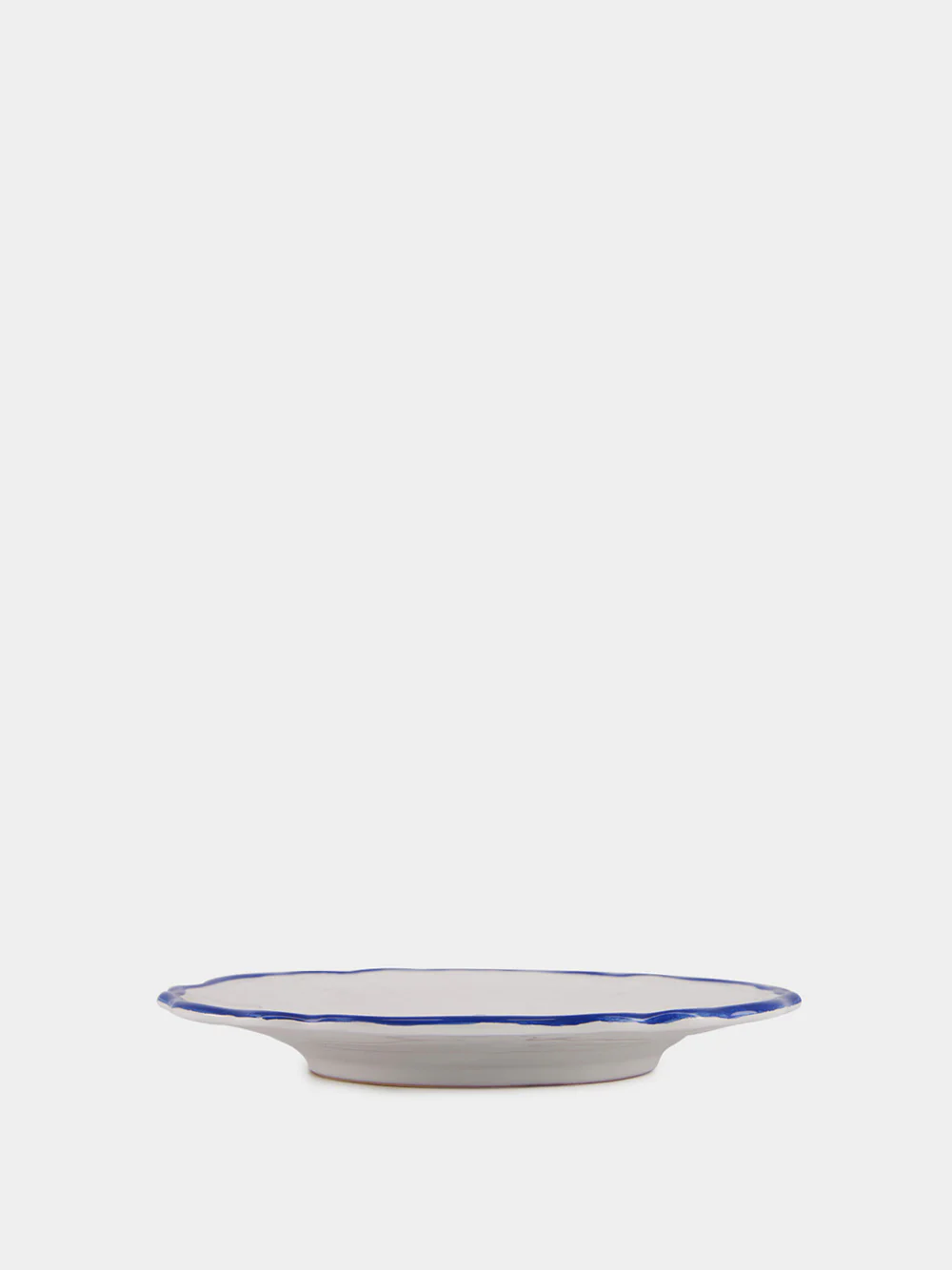 Les Ottomans La Menagerie D'ete collection, white ceramic dessert plate with blue trim and handpainted Shell.