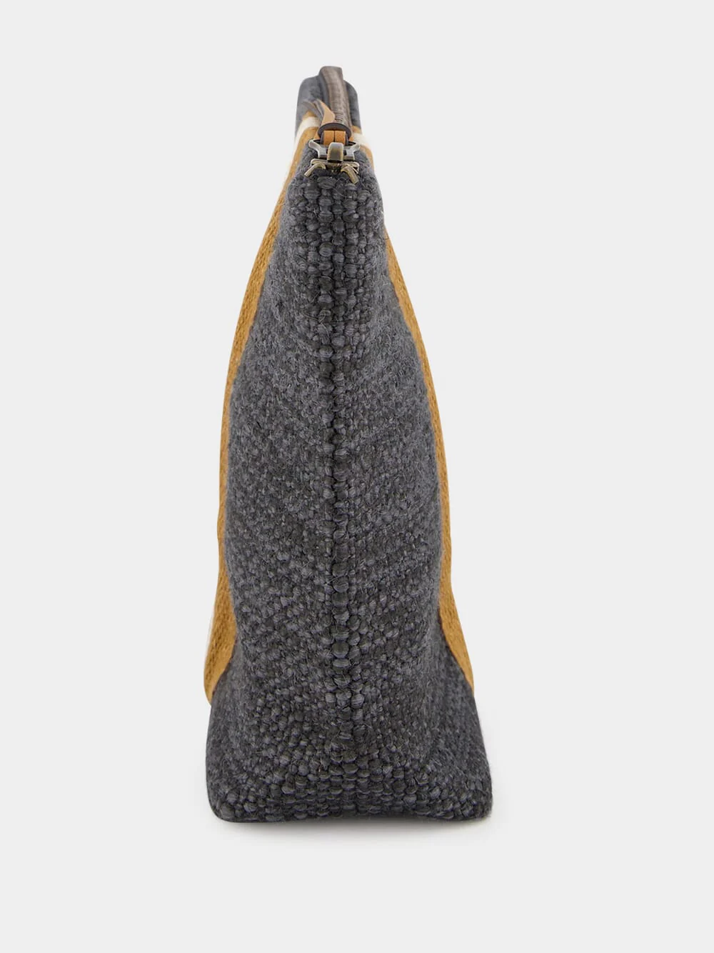 The Hunter Green Jasper Pouch is crafted from a luxurious linen-wool blend, available in four rich, warm colors. This stylish accessory features bold stripes in cream and brown on a black background. Perfect for organizing small essentials, it combines practicality with a chic, rustic design.